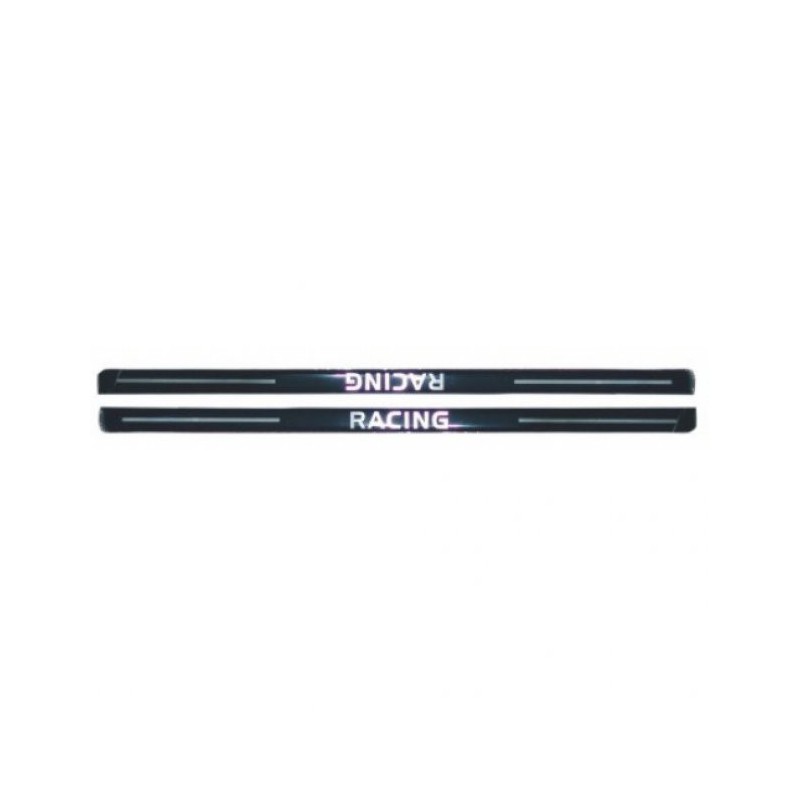 Ochrana prahů před poškrábáním. Komplet - 2 kusy. Nápis RACING Vysoká odolnost vůči vnějším vlivům. Vylepšení designu Vašeho vozu. Připevnění pomocí oboustranné lepící pásky.Materiál: aluminium, plast .Rozměry: 2 x 53 cm.